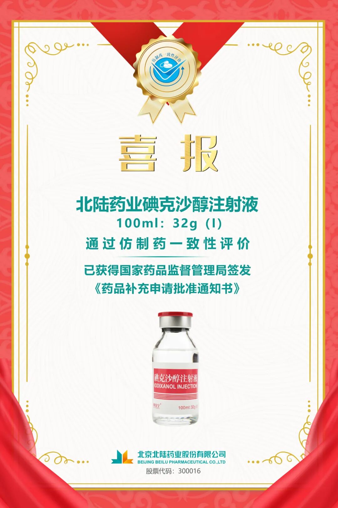 今日,公司收到国家药品监督管理局颁发的关于碘克沙醇注射液(100ml:32g(I))的《药品补充申请批准通知书》(通知书编号:2021B01356)。公司碘克沙醇注射液通过仿制药质量和疗效一致性评价,是公司继碘海醇注射液之后第二个通过一致性评价的对比剂产品。