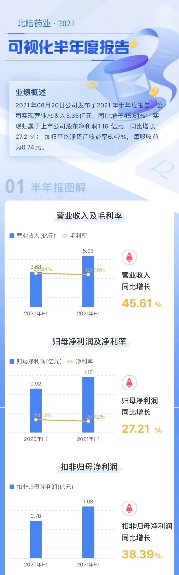 今日,北陆药业(300016)正式发布《2021年半年度报告》。上半年,公司实现营业收入5.35亿元,同比增长45.61%,其中母公司实现营业收入5.13亿元,同比增长41.11%;实现净利润1.16亿元,同比增长27.21%,其中母公司净利润1.26亿元,同比增长30.52%;实现扣除非经常性损益的净利润1.08亿元,同比增长38.39%,其中母公司扣非后净利润1.17亿元,同比增长50.76%。