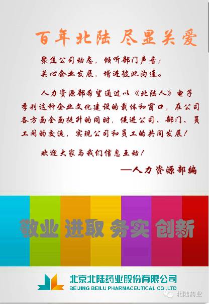 欢迎大家加入北陆药业,从这一刻起,你就成为这个大家庭里的一份子。我们的努力是北陆的骄傲,北陆的光彩由大家来点亮。我们荣辱与共,共同跨越;我们携手同行,共创佳绩;让我们共同挥洒汗水,创造自己的新篇章。为奠定“百年北陆”奉献我们的力量。.