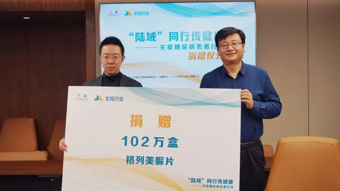 日前,“‘陆域’同行传健康——关爱糖尿病患者行动”在京正式启动。北陆药业捐赠102万盒公司降糖产品——迪北®格列美脲片,旨在关爱我国偏远、欠发达地区糖尿病人群,帮助患者个人及家庭降低“因病致贫、因病返贫”的经济风险。